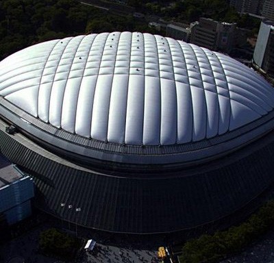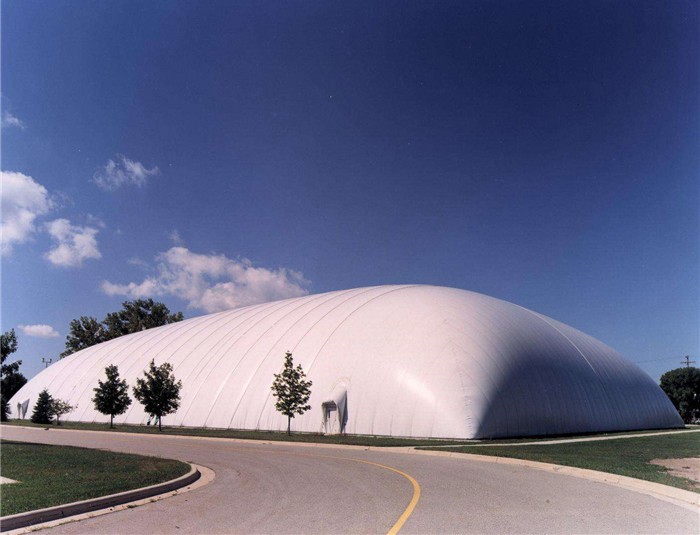氣膜結(jié)構(gòu)由于只承受張力,可使材料受力性能得到充分發(fā)揮,加之其獨(dú)特的性能特點(diǎn)和優(yōu)勢(shì),當(dāng)前已越來越廣泛地應(yīng)用于大跨度結(jié)構(gòu)建筑中。它以優(yōu)良的織物為材料,由膜內(nèi)空氣壓力支承膜面,或利用柔性鋼索、剛性支撐結(jié)構(gòu)通過彎曲內(nèi)面力傳送,將膜面繃緊,從而形成具有一定剛度、張力,能夠覆蓋大跨度空間的膜結(jié)構(gòu)體系。